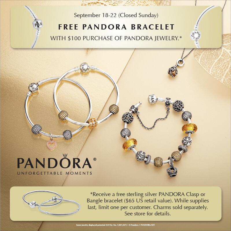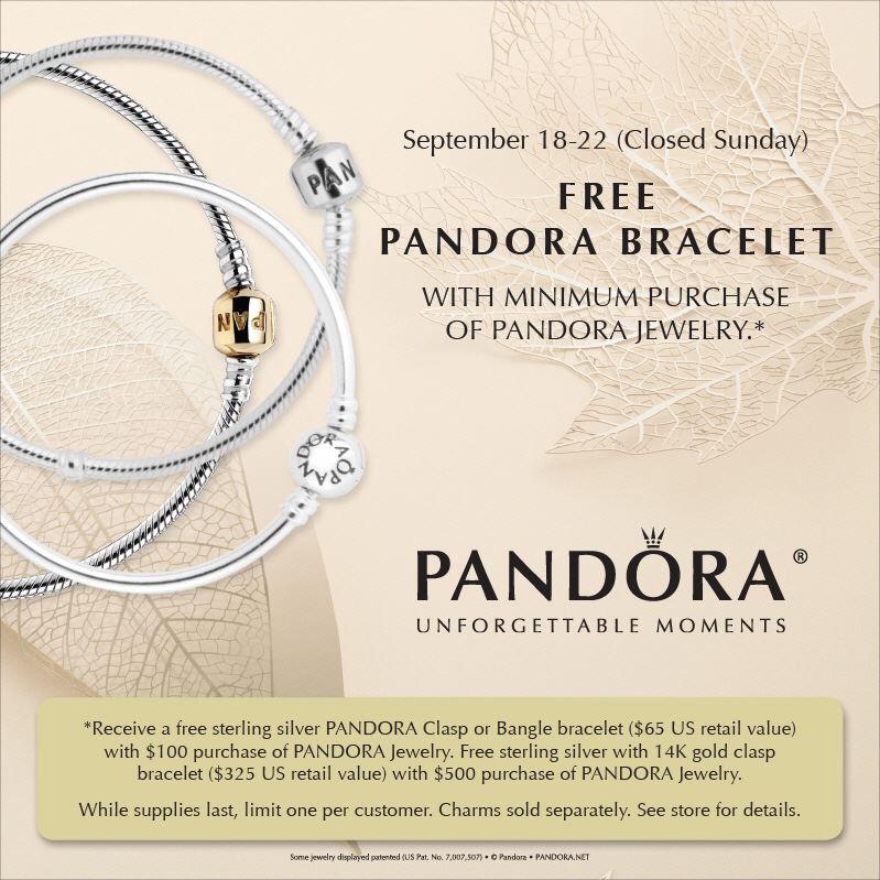 - spend $100 USD ($125 CAD) and receive your choice of the Pandora silver barrel clasp bracelet, the Pandora silver bangle or the Pandora Essence bracelet
