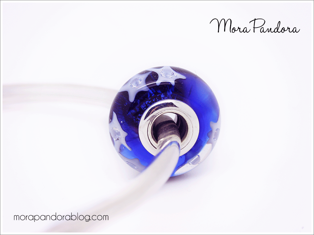 The murano features the smaller Pandora core, as pictured below. This image also really works really well to show off all the depth and variety of colour in this one little bead – the deeper navy at the core of the bead, the hint of iridescent sparkle and the brighter blue of the glass itself. The pretty white of the stars really sets it all off, too!