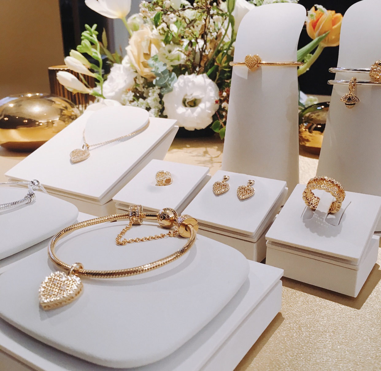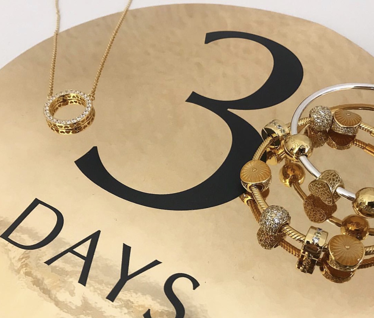 The Shine jewellery is 18kt-gold plated sterling silver jewellery. It will look quite different to Pandora’s existing solid gold line, which is 14kt, and much less yellow in person.