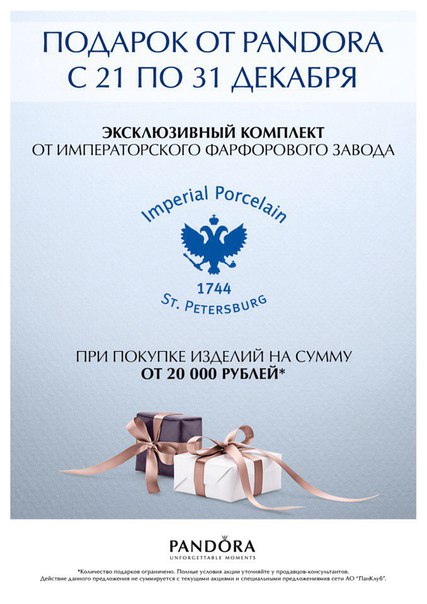 - Cup & Saucer GWP: 21st – 31st December. Spend 20,000 Russian rubles and receive an Imperial Porcelain cup and saucer, with Pandora branding: