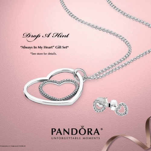 - Pandora Valentine’s Gift Sets: Starting from January 15th. All sets come with heart-shaped gift box. 1) From the Heart bracelet set: heart-clasp bracelet, two Steady Heart clips and Love all Around charm for $200 USD. 2) Forever Mine set: Essence bracelet with the Dedication charm for $100 USD. 3) Always in my Heart set: Be My Valentine stud earrings plus new Heart-to-Heart necklace for $150 USD. 4) Sweetheart set: Sweetheart charm, available for limited-time only, with exclusive heart-shaped gift box for $75 USD.