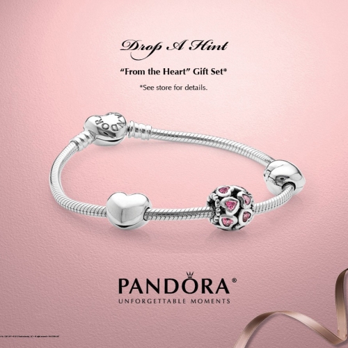 - Pandora Valentine’s Gift Sets: Starting from January 15th. All sets come with heart-shaped gift box. 1) From the Heart bracelet set: heart-clasp bracelet, two Steady Heart clips and Love all Around charm for $200 USD. 2) Forever Mine set: Essence bracelet with the Dedication charm for $100 USD. 3) Always in my Heart set: Be My Valentine stud earrings plus new Heart-to-Heart necklace for $150 USD. 4) Sweetheart set: Sweetheart charm, available for limited-time only, with exclusive heart-shaped gift box for $75 USD.